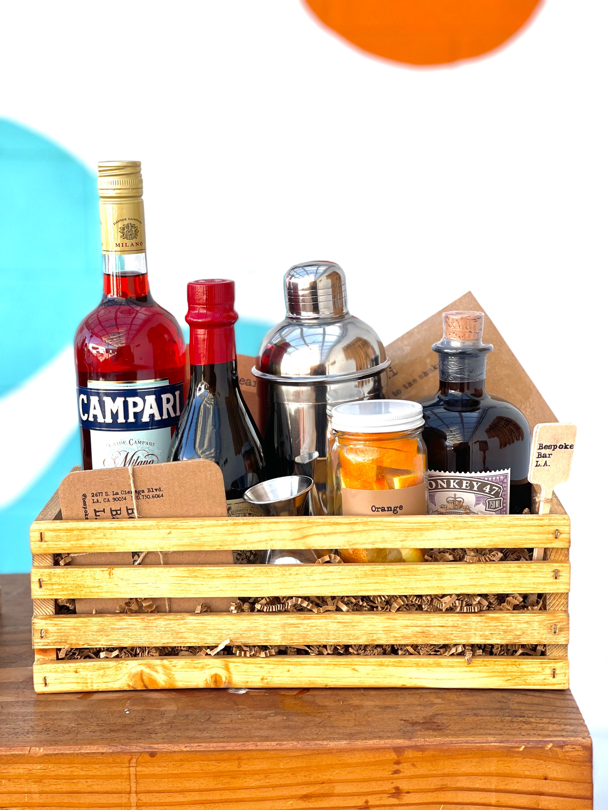 What a box! This special Negroni box has the beautiful and complex Monkey 47 with Campari and Sweet Vermouth. Also included is organic, orange slices and a stainless steel shaker and jigger. All in a hand-made wooden box!